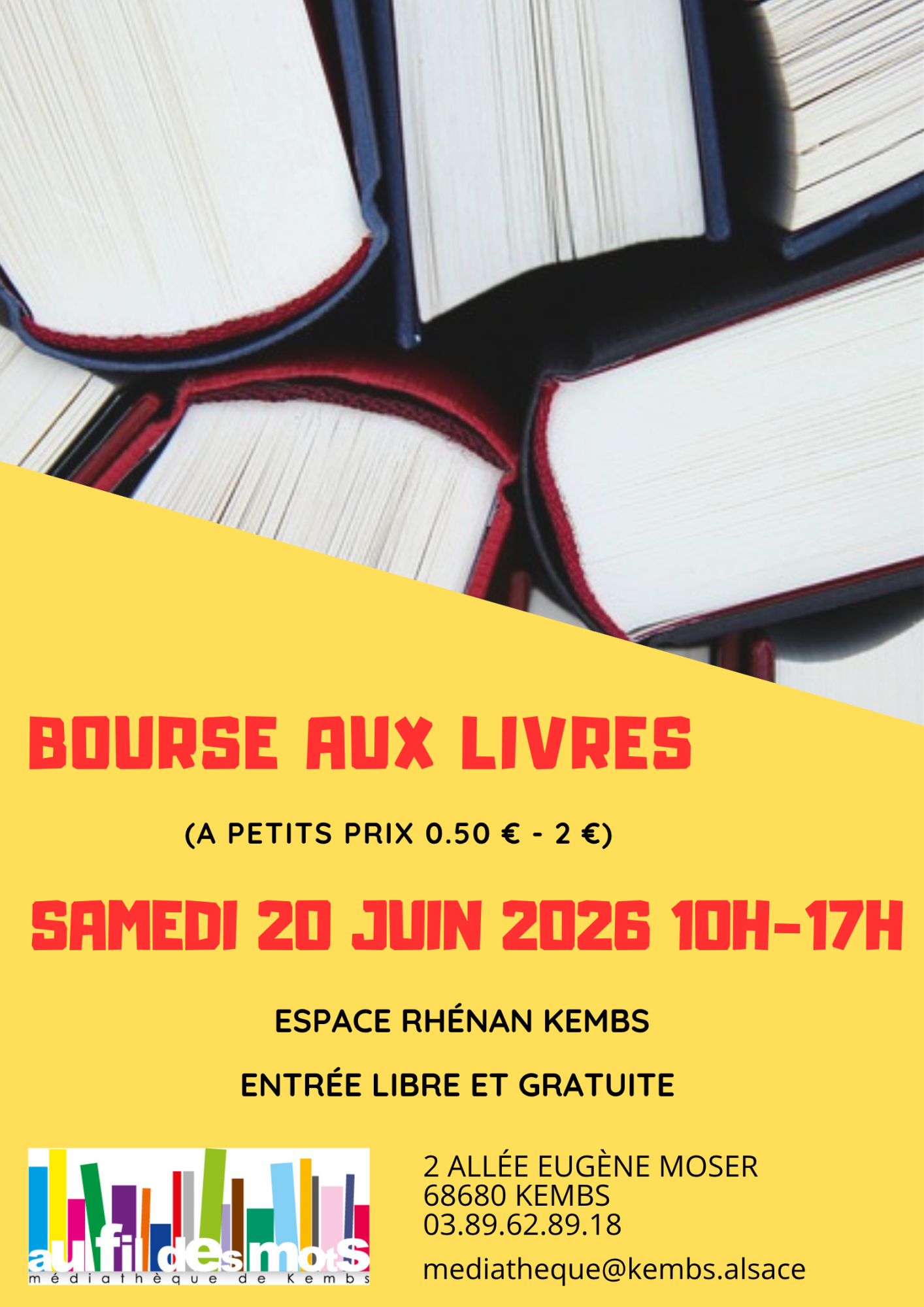 Les Amis de la Médiathèque Au Fil des Mots vous invitent à leur 12ème édition de leur bourse aux livres, CD et DVD le samedi 20 juin de 10h à 17h, à l'Espace Rhénan.