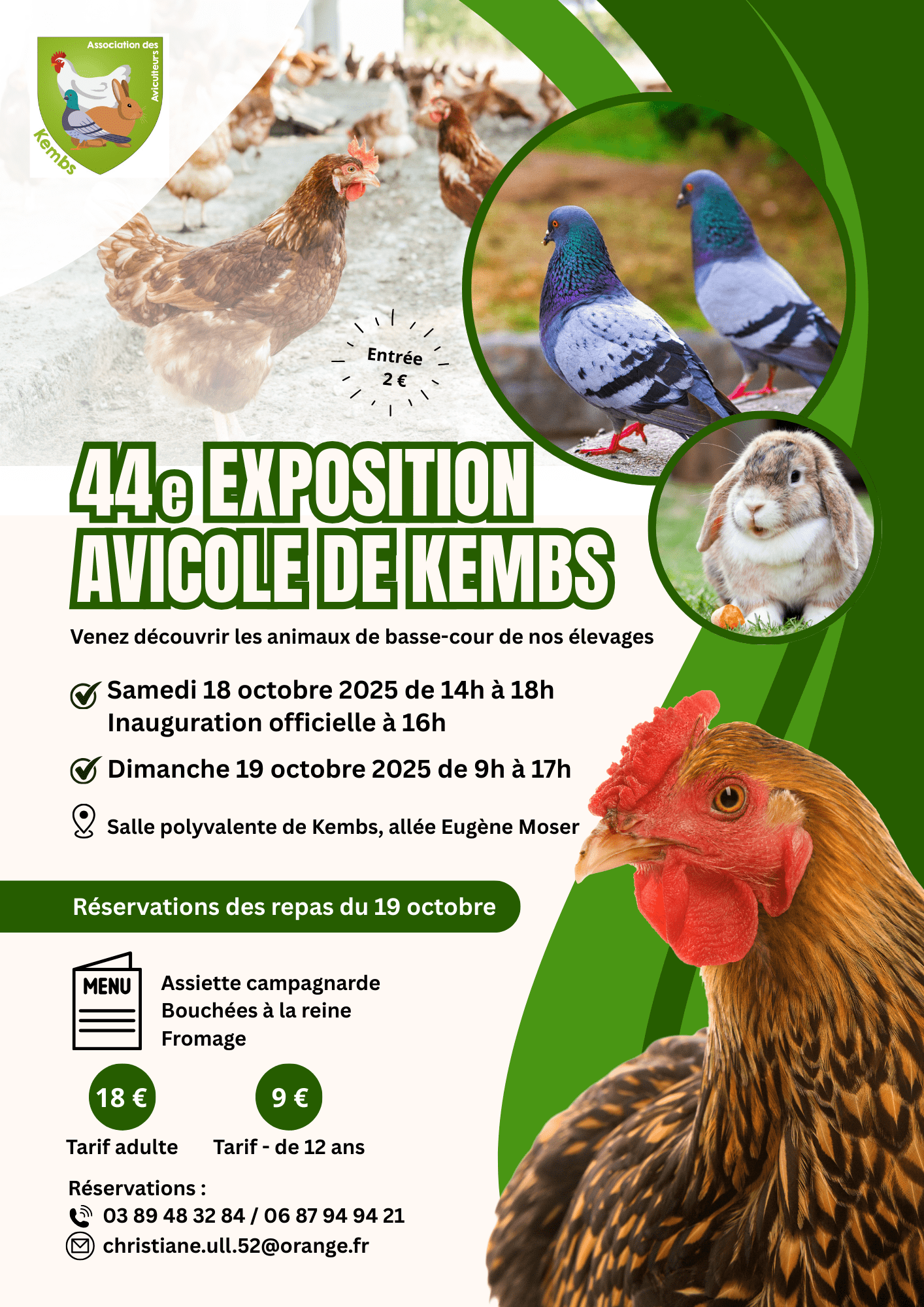 L'association des aviculteurs vous invite à la 44e exposition avicole les samedi 18 octobre de 14h à 18h (inauguration officielle à 16h) et dimanche 19 octobre de 9h à 17h à la salle polyvalente de Kembs.