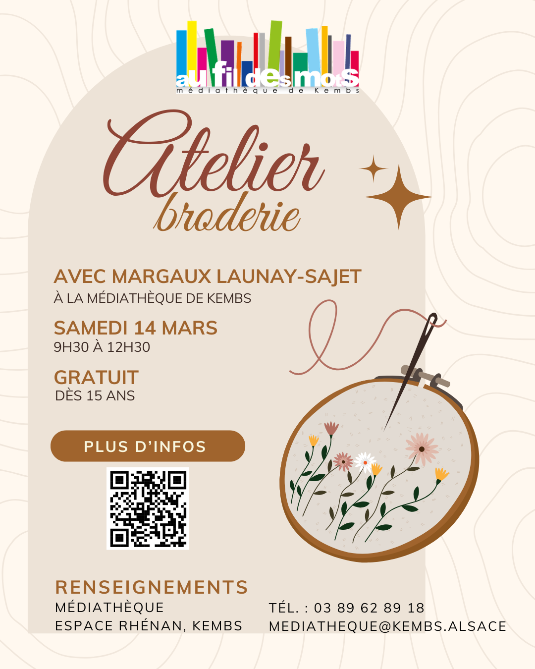 La médiathèque vous donne rendez-vous samedi 14 mars de 9h30 à 12h30 pour un atelier de broderie.
