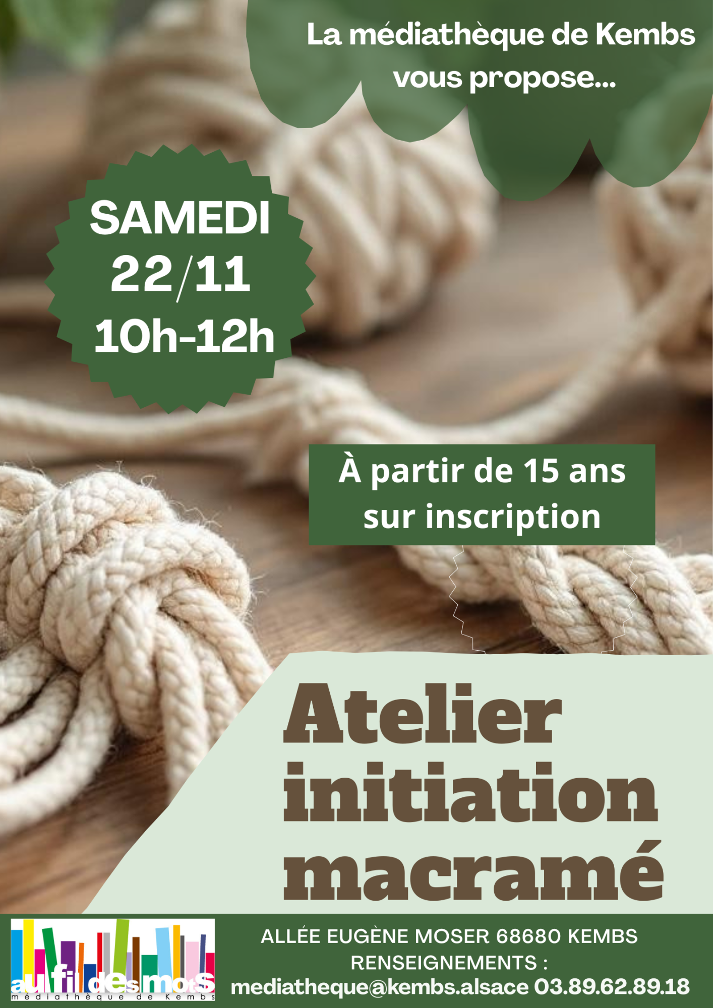 Envie de découvrir une activité créative et relaxante ? La Médiathèque Au Fil des Morts vous invite à participer à l’atelier d’initiation au macramé, animé par Patricia, bénévole passionnée et apprenez à transformer un simple vase en une décoration originale et élégante. Le matériel sera fourni.